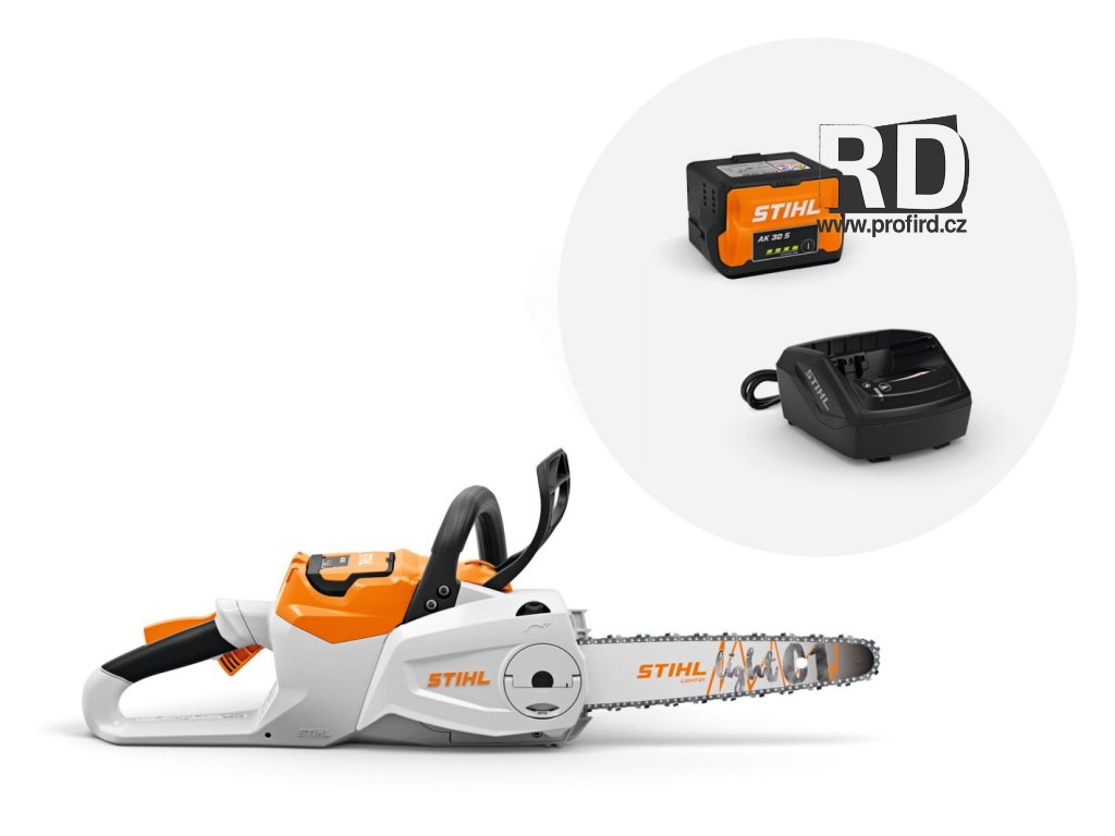 Poznámka: Plný rozsah této akumulátorové řetězové pily lze používat pouze s akumulátorem STIHL AK 30 S. Při použití jiných akumulátorů STIHL nemůžeme zaručit, že budou k dispozici všechny funkce ani že bude dosaženo maximálního možného výkonu pily.