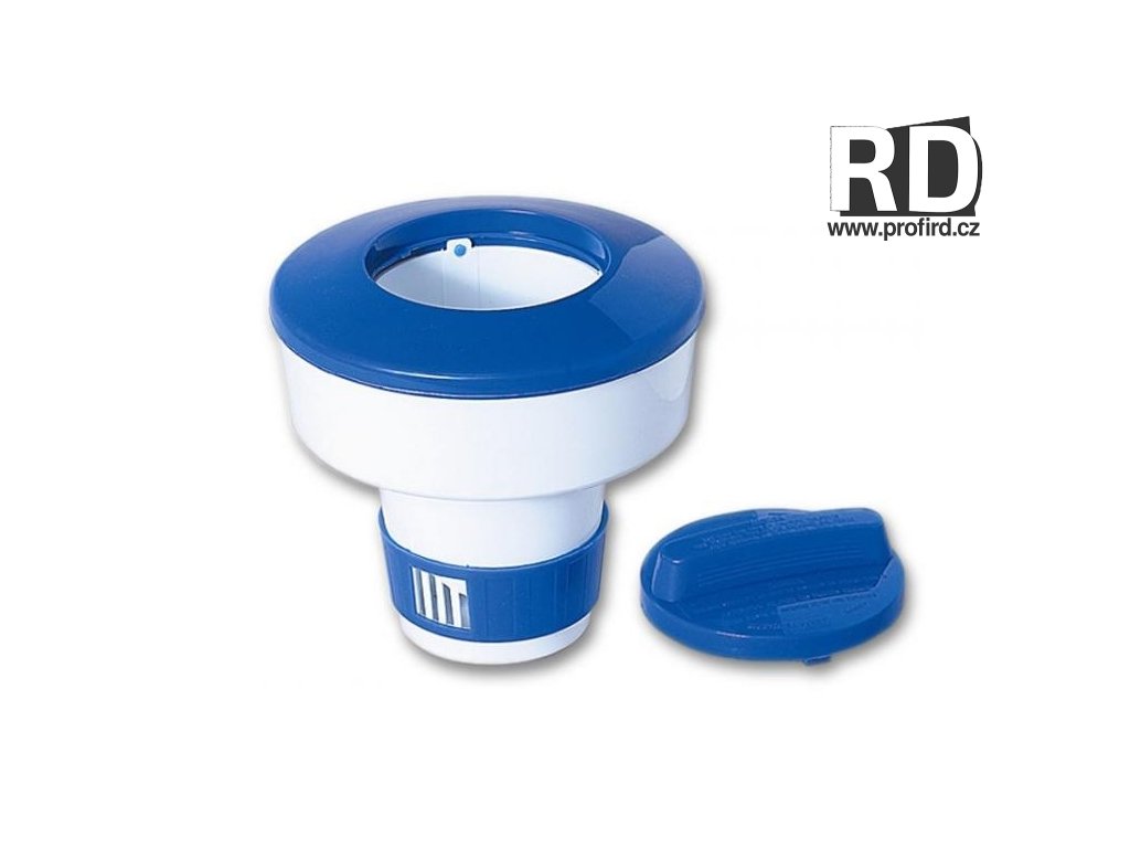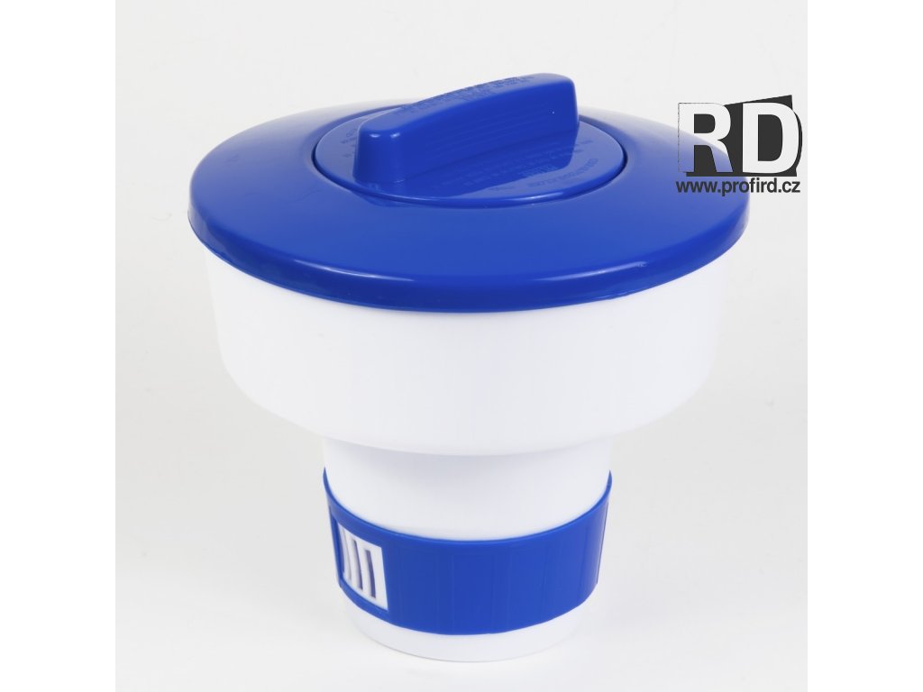 Plovoucí plastový dávkovač s regulační mřížkou pro chlorové tablety.